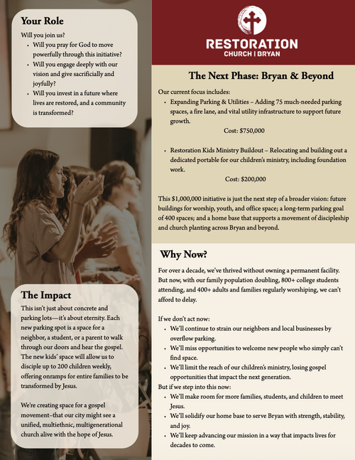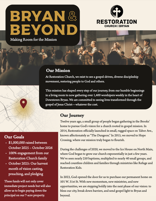 We recognize that buildings, although vitally important for a church to gather, do not constitute God’s church. God’s church is His people - those who are called, saved and transformed by Jesus, and committed to taking the gospel message to the nations. A building is not our vision. Our vision is to continue to grow as a gospel-centered church, devoted to discipleship and diversity. We are beyond excited to continue watching God accomplish his mission to reach Bryan & Beyond, and we are humbled to play a part in His mission.